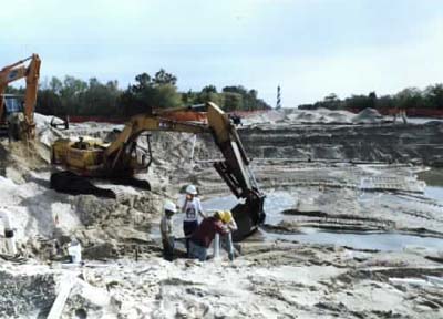 Two power shovels labor to excavate the new foundation area for Cape Hatteras Lighthouse. The footprint of the new foundation will be increased from the present 48 feet diameter to a 70 foot diameter of seamless concrete approximately twelve feet in depth. Back to the edition of: June 1999