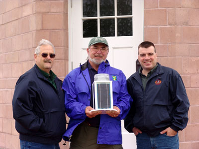 The LED beacon from Carmanah Technologies is delivered to Avery Point Lighthouse on June 10, 2006 (L to R) APLS co-chairman Jim Streeter, APLS co-chairman Ron Foster and Bob Trapani, executive director for the American Lighthouse Foundation