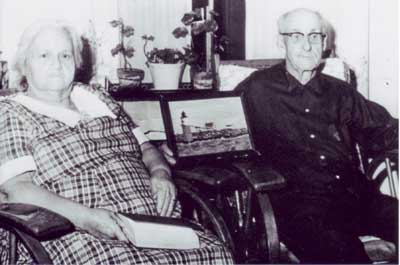 -Florence, age 77, and Fred Batty, age 78, in 1966 when they celebrated their 56th wedding anniversary. Their daughter, Mary, married Floyd Eddinger who was also a Maine Lighthouse keeper. Florence was the daughter of Samuel Cavanor, who was the keeper of Maine’s Ram Island Lighthouse. Batty is holding a painting of Ram Island Lighthouse that he painted and where his wife Florence grew up. Photograph courtesy Diana Trombly.