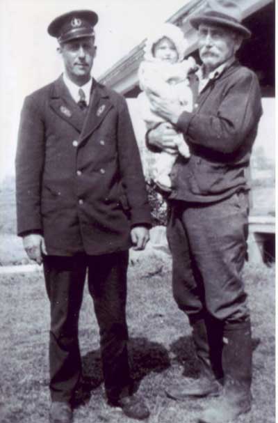 Lighthouse keeper Fred Batty, age 46, with Robert Ettinger Singer, age 63, holding Nancy Louise Singer, four-months old. Photo taken in April of 1943 at Two Bush Island Lighthouse. Photograph courtesy Diana Trombly.