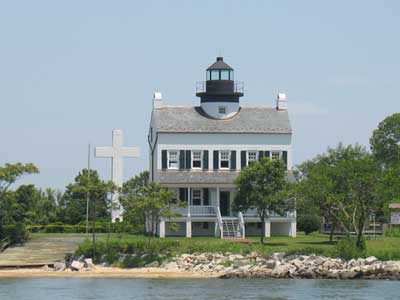 The newly reconstructed Blackistone Lighthouse on St. Clement's Island, which is the birthplace of the State Maryland. The large white cross was erected in 1934 as part of Maryland's 300th birthday, to honor the site of the first English speaking Roman Catholic mass that was held here, which led to the colony being founded based on religious freedom. Photograph courtesy of the St. Mary's County Museum Division, Maryland.