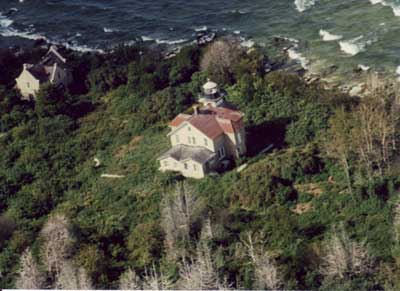 Wisconsin's Pilot Island Lighthouse Station as it appeared in 1995. The elaborate building in the upper left hand corner of the photo is the Pilot Island Fog Signal Building. When the steam-powered foghorn was used here, it could be heard for 12 miles and was a duplicate of the one that was displayed at the Paris World's Fair. These beautiful structures were all abandoned and left to decay from the elements. Photograph courtesy of Bob and Sandra Shanklin, "The Lighthouse People." Back to the edition of: August 2008