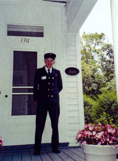 David A. Dietrich, maternal great grandson of lighthouse keeper Andrew Jackson Davenport posed in his replica lighthouse keepers uniform on the porch of the 1860 home that lighthouse keeper Andrew Jackson Davenport lived in while he was a lighthouse keeper at Michigan’s Pentwater Pierhead Lighthouse from 1911 to 1912. Back to the edition of: August 2008