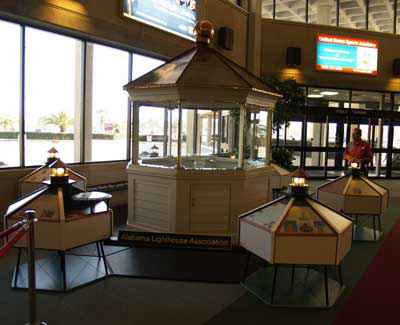 Miniature replicas of Alabama’s Mobile Middle Bay Lighthouse provide interpretative kiosk displays around the nearly completed lighthouse lantern room exhibit now on display at the Mobile Regional Airport in Mobile, AL. Back to the edition of: March 2009