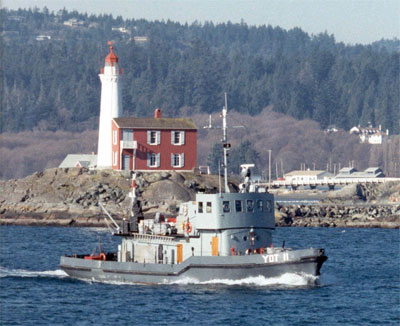 HMC YDT11 (Her Majesty's Canadian Yard Diving Tender 11) passing the lighthouse.