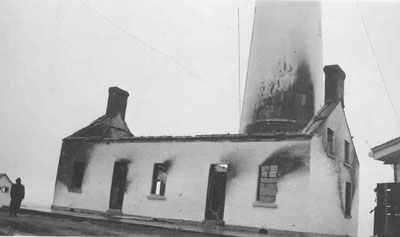 This 1950 photo shows fire damage to a building attached to the tower. The damage was immediately repaired.