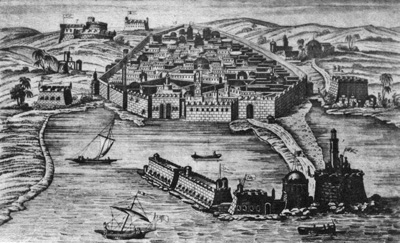 A lighthouse is seen at the lower right in this engraving, circa 1680.