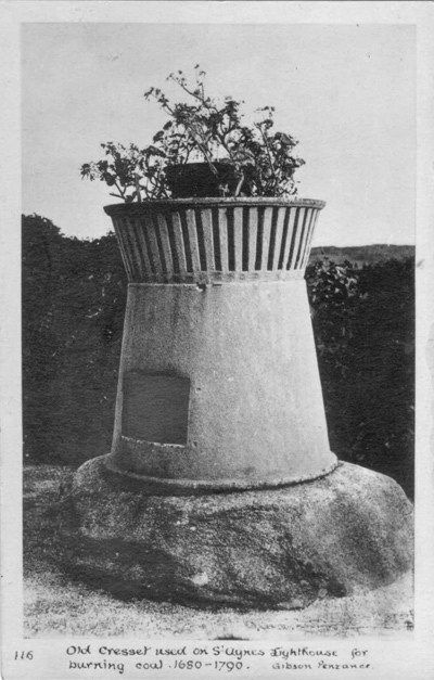 Although the caption on this photo says the cresset was used until 1790, Peter Williams, in his book "Beacon on the Rock," writes that it was in use until 1809. He adds that the cresset is now on display on the adjacent island of Tresco in the Isles of Scilly and is one of the few remaining examples of this type of basket.