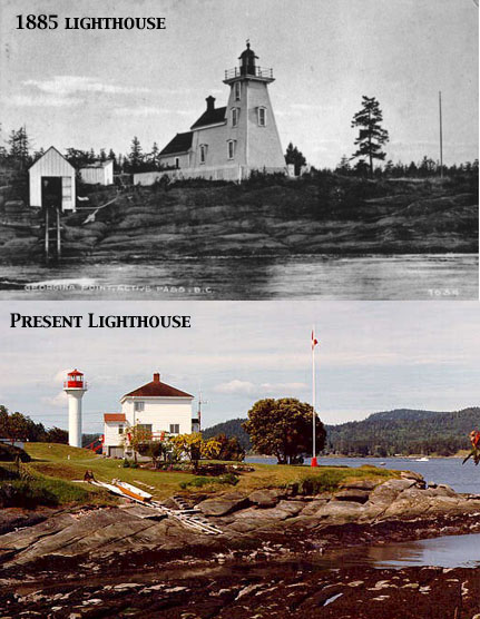 Earlier Towers? 1885: White, square pyramidal tower with red lantern, attached to keeper's house. 1940: Lantern on top of two-story keeper's dwelling. Date Established: 1885 Date Present Tower Built: 1969 Current Use: Active aid to navigation. Open To Public? No. Directions: The Tsawwassen-Swartz Bay Ferry passes near this lighthouse. Keepers: Henry ("Scotty") Georgeson (1885-1921), Arthur Broughton Gurney (1921-1944), Clarence Edgar Carver (1944-1948), Hugh Sutherland Gurney (1947), Harold Whalen (assistant, 1963-1965), Don Vigurs (assistant, 1963), Jean Beaudet (?), Elmer Cordoni (assistant, ?), Don DeRousie (1983-1993)