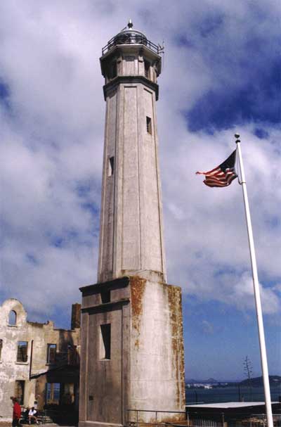 Other Buildings? 1909 storage building. 1909 keeper's quarters destroyed by fire in 1970. Earlier Towers? 1854: Cape Cod style dwelling with brick tower in center. 1909: Lighthouse was torn down to make room for maximum security prison. Date Established: 1854 (6/1/1854) Date Present Tower Built: 1909 Date Automated: 1963 Optics: 1854: Third order Fresnel lens; 1902: Fourth order Fresnel lens. Fog Signal: Originally bell; now electric Klaxon automated fog signal. Current Use: Active aid to navigation, in National Park. Open To Public? Grounds only. Museum? There is a visitor center on the island. Directions: Tours to Alcatraz Island leave Pier 41 at Fisherman's Wharf in San Francisco. Phone (415) 705-5555 or (415) 773-1188, or see www.blueandgoldfleet.com for prices and schedules. An audio tour is available. Mapquest URL: Click here to get a map to this lighthouse! Listed on the