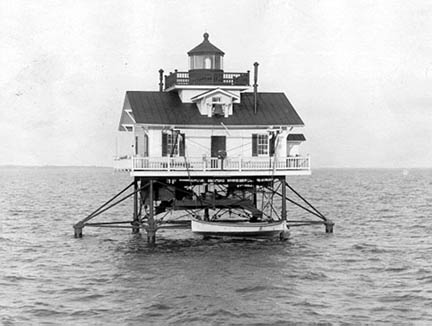 Notes: An earlier lighthouse in this vicinity was in use 1831-1839. Some of the parts of the 1858 lighthouse were incorporated into the Nansemond River Lighthouse in Virginia. In the mid 1950s the government wanted the abandoned lighthouse removed from the site. They accepted a $10.00 offer from Elijah Tate, a marine salvager, to remove the lighthouse. While attempting to move the structure to land, a storm hit the area and the lighthouse tipped over and sank. At the same time, Tate was also moving the nearby Wade Point Lighthouse, and it met the same fate. The 1877 lighthouse was replaced by a modern automatic light on the original foundation in 1955. (The old foundation has been removed in recent years.) The Town of Manteo has constructed a replica of the lighthouse on the town's waterfront (see separate entry). Description of Tower: 1858: Hexagonal cottage-style dwelling with lantern on top, on screwpile foundation. 1877: Lantern on roof of rectangular cottage-style dwelling, on screwpile foundation; 33 feet high. This lighthouse was about 100 yards SSW of the previous lighthouse.