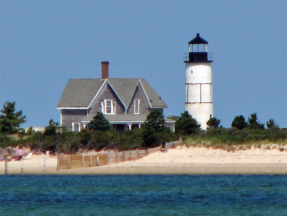 Other Buildings? 1880 1.5 story wood keeper's house. Earlier Towers? 1826: Brick keeper's house with lantern on roof. Date Established: 1826 Date Present Tower Built: 1857 Date Deactivated: 1931 Optics: c. 1857: Fifth order Fresnel lens. Current Use: Private residence. Open To Public? No. Directions: Sandy Neck Light can be seen distantly from Millway Beach in Barnstable; it is accessible via a difficult six-mile hike over sand. It is best seen by boat. Hyannis Whale Watcher's cruises leaving Barnstable Harbor pass the lighthouse; call (508) 362-6088 or (888) WHALE-WATCH for information and reservations. The cruises run daily from April through October. To reach Hyannis Whale Watcher from US Route 6: take Exit 6. Take MA 132 south toward Hyannis. At the first set of lights take a left onto Phinney's Lane. Follow the road straight over the railroad tracks and through a set of lights. The dock and office are at the end of the road at Millway Marina. Mapquest URL: Click here to get a map to this lighthouse! Listed on the