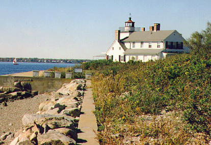 Notes: When Conimicut Light was built in 1868, Nayatt Point Light's Fresnel lens was transferred to the new lighthouse and the old light was discontinued. The 1828 keeper's house, although much changed, is Rhode Island's oldest lighthouse keeper's house. The property has been on the market since 1997 for an asking price of $1.275 million. Tower Height: 25 Height of Focal Plane: 31 Description of Tower: White square brick tower attached to keeper's house, with red cast iron lantern.