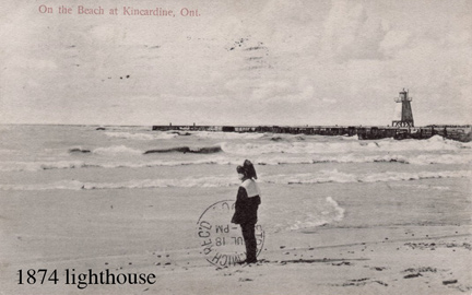 Notes: The Kincardine range was discontinued in the late 1990s, and the front light then became known as the Kincardine Sector Light. Tower Height: 20 Height of Focal Plane: 32 Characteristic and Range: Occluding light, 3 flashes every 10 seconds (5 seconds, 1 second, 1 second), with red, white and green sectors. Description of Tower: 1874: White, square, pyramidal wooden tower on wooden piles, 20 feet tall, at the end of the pier. 1903: Brown, square, steel skeleton tower with a white, wooden octagonal lantern, 33 feet tall.