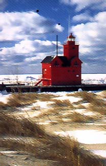 Other Buildings? 1907 two story, twin gable keeper's house. Date Established: 1872 Date Present Tower Built: 1936 Optics: 1936: Sixth order Fresnel lens. Current Use: Active aid to navigation, part of state park. Open To Public? No. Directions: From US Route 31, turn west onto South Business Route 31 (8th Street). Turn right on Columbia Street. Turn left onto 7th Street, and continue 3 blocks to River Avenue. Continue to Douglas Avenue. Head west approximately six miles on Douglas Avenue to Holland State Park. Take the boardwalk to the pier. The lighthouse can be seen across the canal. If you plan to go all the way to the lighthouse, be aware that under a new policy, security guards from the Macatawa Cottagers Association, posted at a gate at the end of South Shore Drive, will provide visitors a card for themselves and their vehicles that is valid for that day only, as well a map showing the pathway leading to the pier. Vehicles without a valid card will be towed. Visits are limited to one hour, and visitors are prohibited from taking with them coolers, blankets, picnic or barbecue equipment. Pets are also prohibited. For information on Lake Michigan lighthouse tours, call the West Michigan Tourist Association at (800) 442-2084 or visit their website at www.wmta.org. For reservations, call Brenner Tours at 800-338-5963. Listed on the