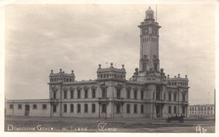 Notes: This building served for many years as lighthouse administrative headquarters ("Dirección General de Faros"). During its years of activity, the lighthouse was listed as "Benito Juarez" (not to be confused with the building currently known as the "Benito Juárez Lighthouse," also in Veracruz). From 1952 to 1964, the main light in Veracruz was shown from the nearby Banco de México building (now the Pemex building). In 1964, it was moved to the top of the Hotel Diligencias. In the early 1990s it was moved to the top of the Hotel Hawaii, and it was discontinued around 2002. Height of Focal Plane: 144 Characteristic and Range: White flash every 7 seconds, visible for 18 miles (1952). Description of Tower: White masonry clock tower on a building.