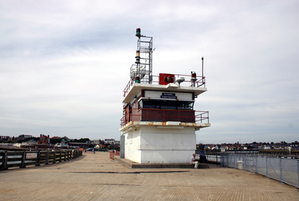 Notes: The original tower here had a regular navigational light (fixed white), established in 1852; a tidal light - red on the incoming tide, green on the ebb - that became active in 1887; and a signal light (red when the channel was obstructed) shown toward the harbor from a window in the tower (1902). Height of Focal Plane: 36 Characteristic and Range: Red flash every 3 seconds, visible for 11 nautical miles. Description of Tower: White and reddish brown square building at the end of the pier.