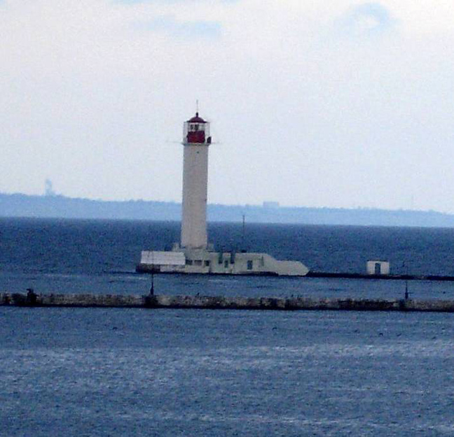 Notes: The 1888 lighthouse at this location was destroyed in fighting at Odessa in 1941. Tower Height: 85 Height of Focal Plane: 88 Characteristic and Range: Three red flashes every 12 seconds; range 15 nautical miles. Description of Tower: White cylindrical concrete tower with red lantern.
