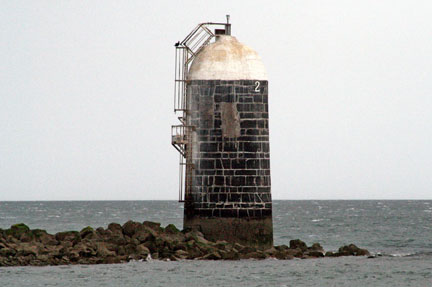 Notes: This lighthouse is on a rough stone breakwater that is not safe for walking, but it can be seen from the south side of the river. Height of Focal Plane: 36 Characteristic and Range: Quick flashing green; range 3 nautical miles. Description of Tower: White concrete pedestal on stone tower.