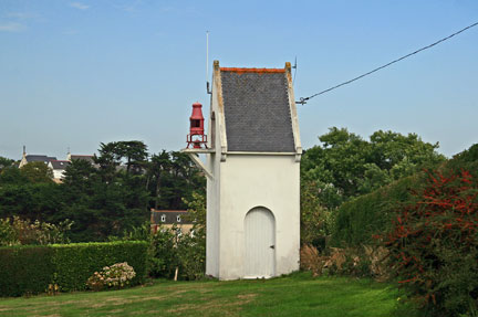 Notes: The front light is shown from a tall skeletal tower. Tower Height: 19 Height of Focal Plane: 128 Characteristic and Range: Occulting red light, three eclipses every 12 seconds; range 7 nautical miles. Description of Tower: White square hut with a black sloped roof; the light is placed on a small platform.