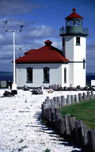 Other Buildings? 1887 1.5 story wood frame keeper's house, 1913 fog signal building, garage, storage building. Date Established: 1887 Date Present Tower Built: 1913 Date Automated: 1984 Optics: 1913: Fourth order Fresnel lens, now VRB-25 optic. Current Use: Active aid to navigation, Coast Guard housing. Open To Public? Yes. Directions: The lighthouse is at Beach Drive and Alki Avenue in southwestern Seattle. Mapquest URL: Click here to get a map to this lighthouse! Keepers: Harry D. Mahler (1913-1930); Ray E. Dunson(1920-1933); Charles E. Elliott(1939-1940); Albert G. Anderson(1950-1970); R. W. Keeling (July 1964 - August 1964)