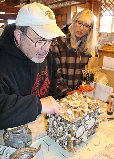 Shell biologist Alan Rammer and Rasmus Petersen’s great-granddaughter-in-law, Gail Petersen, examine the box Rasmus made for his wife, Charlotte, using the ballast shells from the beached schooner Poltalloch. If you look closely, you can see the heart shape outlined in shells on the side of the box. (Courtesy Westport Maritime Museum) Back to the edition of: May/Jun 2023
