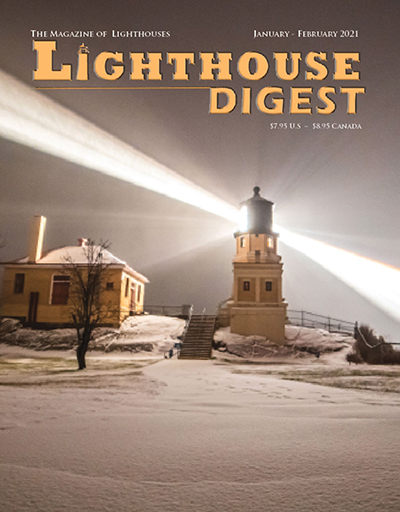 Minnesota’s Split Rock Lighthouse is shown on our cover. The photograph was taken on November 10, 2020, when its beacon was relighted to memorialize the 29 crewmen of the SS Edmund Fitzgerald who lost their lives when the ship sank in Lake Superior in a storm on November 10, 1975. The 3rd order Fresnel lens is lighted every November 10th to honor their memory.