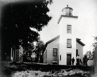 This undated image of the first South Fox Island Lighthouse, built in 1867, shows two keepers and the lighthouse dog in front of the lighthouse. The lighthouse was in use until 1934 when it was replaced by a tall skeletal tower in 1934. The structure shown here still stands and is in the process of being restored. (Lighthouse Digest archives.) Back to the edition of: Mar/Apr 2017
