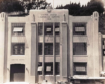Shown here is the front façade of one of the art-deco style buildings that were built in 1930 at California’s Yerba Buena Lighthouse Depot on San Francisco Bay, which later became known as the San Francisco Coast Guard Base.