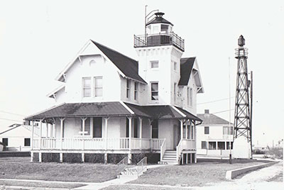 When the beacon atop the cupola was removed from the Sea Girt Lighthouse, it was relocated to the top of a skeletal tower that was erected next to the lighthouse. (Lighthouse Digest archives Robert Lewis Collection.) Back to the edition of: Sep/Oct 2017