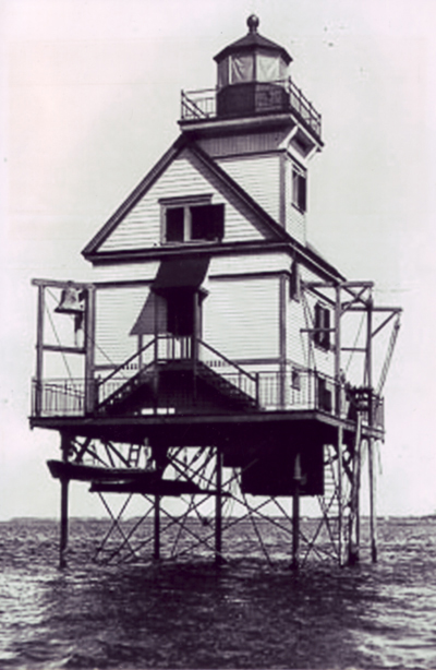 The Killick Shoal Lighthouse is more commonly, but incorrectly, known as the Killock Shoal Lighthouse. It seems that a postcard manufacturer mistakenly named his post card of the light as Killock Shoal and for some reason the name stuck. If you look closely at this rare photo of the no longer standing lighthouse, you will notice that the shades in the lantern room were drawn to protect the lens from the harmful rays of the sun. Living quarters were cramped but comfortable at this well maintained station. (Lighthouse Digest archives)