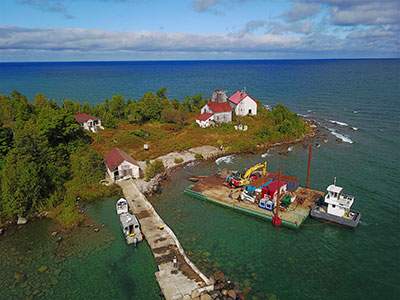 Aerial view of the barge and equipment that was used in the demolition of the Hope Island Lighthouse Station in the Georgian Bay in Lake Huron, near Midland, Ontario, Canada. Directly behind the boat house can be seen one of the homes that the lighthouse keepers once lived in. Everything is now gone. (Courtesy Priestly Demolition.) Back to the edition of: Jul/Aug 2018