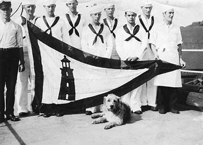 The crew and their mascot of the U.S. Lighthouse Service lighthouse tender Sumac took some time to proudly pose with their U.S. Lighthouse Service flag. (Courtesy, Hazel Franseen.) Back to the edition of: Jul/Aug 2018