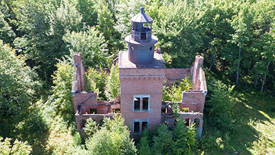 Recent aerial view taken by a drone of the abandoned Fourteen Mile Point Lighthouse. Back to the edition of: Nov/Dec 2018