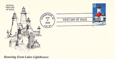 In 1995, the St. Joseph North Pierhead Lighthouses were featured on a U.S. Postage Stamp that was part of a set of five Great Lakes Light Stations that were issued by the Postal Service. This cached envelope is the highly collectible First Day of Issue postmark for the lighthouse postage stamp. (Lighthouse Digest archives.)