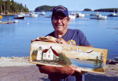 George Sanford Morrison proudly displays a handed-painted wooden plaque by Cutler, Maine artist Pam Britton that was given to Morrison and his wife Wendy as an appreciation of their volunteer efforts at Little River Lighthouse in Cutler, Maine by the Friends of Little River Lighthouse. Back to the edition of: November 2010