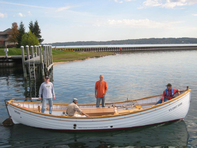 Historic and now restored rescue craft motoring out of the harbor into Grand Traverse West Bay in Greilickville, Michigan. Pictured left to right are, Jeff Shook at the tiller, Mark Pleune, George Powell and Bruce Lehman.