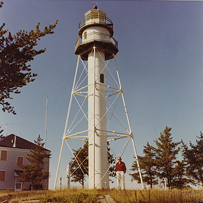 Local historian Leo Capser is shown standing at the base of the LaPointe Lighthouse in a photo most likely taken by keeper Ben Hudak. This image shows a side view of the triplex keeper’s house. (Leo Capser collection, Madeline Island Museum.) Back to the edition of: Jan/Feb 2020