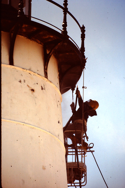 Edgartown Lighthouse being sandblasted in the late 1980s in preparation for a new coat of paint. (Photograph courtesy William Waterway Marks) Back to the edition of: December 2010