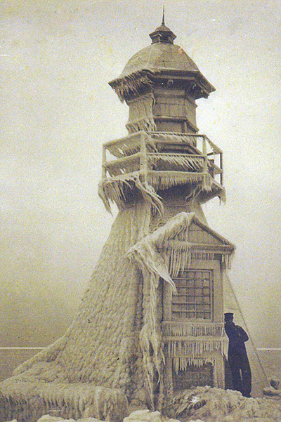 One of the Sheboygan Breakwater Lighthouses in Sheboygan, Wisconsin was this “Pagoda” style lighthouse, which was of similar design to other structures that were built in Milwaukee, Racine, Waukegan, and Kenosha, Wisconsin as well as in Petoskey, Michigan. None of these structures stand today. The lighthouse is shown in this dramatic ice-covered scene with its keeper leaning against the structure. (Lighthouse Digest archives) Back to the edition of: Sep/Oct 2020