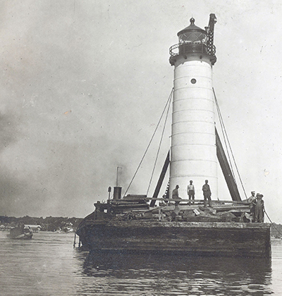 Wisconsin’s Sheboygan Lighthouse is shown here being floated from the old North Pier to its new location on the North Breakwater. The move took three days to complete. (Lighthouse Digest archives) Back to the edition of: Sep/Oct 2020