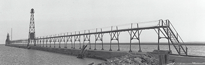 In 1916, a 60-foot erector set style steel tower was installed on the pier approximately 250 yards from the Menominee North Pier Lighthouse so that the towers could act as range lights to guide mariners into the harbor. The elevated metal walkway, shown here, was originally used at the Wisconsin’s Sheboygan North Pier Lighthouse and moved here in 1917. It was used to get to the lighthouse in inclement weather when waves or ice would cover the pier. The walkway was removed after the lighthouse was automated in 1972. (Lighthouse Digest archives)