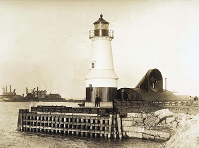 A lighthouse keeper poses proudly at the base of the Buffalo Harbor South Entrance Lighthouse for this photo taken in 1911 when the lighthouse was in its heyday. (Lighthouse Digest archives.) Back to the edition of: Nov/Dec 2020