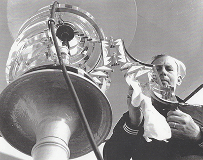 Ralph Banks cleaning the lens and polishing the brass fittings of the 5th order Fresnel lens at Marshall Point Lighthouse. Back to the edition of: Nov/Dec 2020