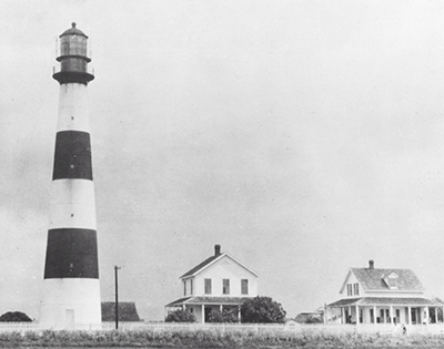 Historic image of Point Bolivar Lighthouse, also known as Bolivar Point Lighthouse, showing the original keepers’ homes. (Lighthouse Digest archives) Back to the edition of: May/Jun 2021