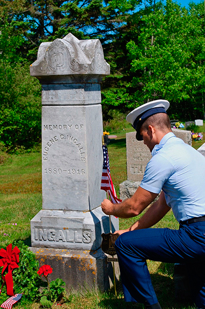 Right: A member of the United States Coast Guard places the flag onto the U.S. Lighthouse Service Memorial Marker at the ceremony honoring lighthouse keeper Eugene C. Ingalls. Back to the edition of: May/Jun 2021
