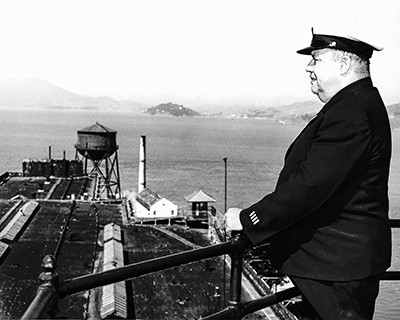 The original 1954 caption read, “On the ledge surrounding the lens room at Alcatraz Light, Keeper Edward H. Schneider looks out over the prison roof and the ocean. The 100,000-candlepower light is 214 feet above powerful, swirling currents that add to the security of the famous ‘Rock.’” (U.S. Coast Guard photo, Courtesy of Michelle Campbell Hamecs) Back to the edition of: Nov/Dec 2021