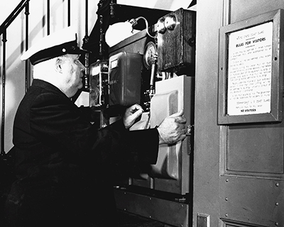 The original 1954 caption read, “About dusk, Keeper Edward H. Schneider turns on famous Alcatraz Light. Note the sign: ‘Rules for Visitors . . . No Visitors.’” (U.S. Coast Guard photo, Courtesy of Michelle Campbell Hamecs) Back to the edition of: Nov/Dec 2021