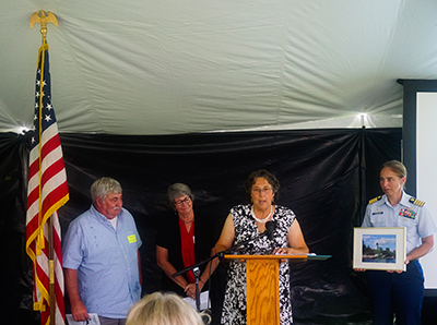 U.S. Coast Guard CAPT Amy Florentino (r) helps Elaine Jones (speaking) present a framed photo of the restored lighthouse to the family of keeper James McCullough, who served at Burnt Island Light from 1958 to 1962. Photo by Debra Baldwin
