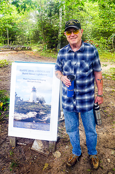 Former Coast Guard keeper Hank Sieg stands by the “Happy 200th Anniversary” welcome sign at the entrance to the path leading up to Burnt Island Lighthouse from the dock. Back to the edition of: Nov/Dec 2021